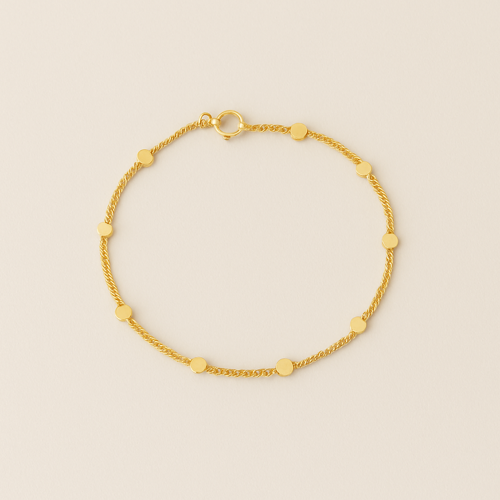The Scattered Stars Bracelet is the distilled essence of light — pure, refined, and endlessly wearable. Each polished gold dot catches the light like a quiet flicker of dawn, creating a smooth, unbroken rhythm of reflection along the neckline.