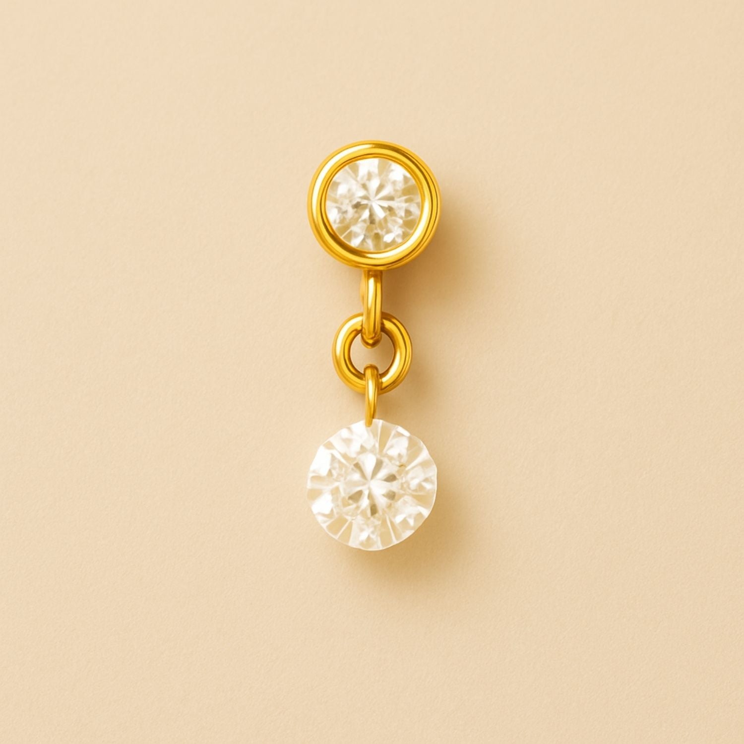 Two sustainably created diamonds — both round brilliat-cut — are linked in a fluid composition of light. Suspended from a polished gold hinge, the lower diamond dances gently as you move, creating a quiet rhythm between stillness and flow.