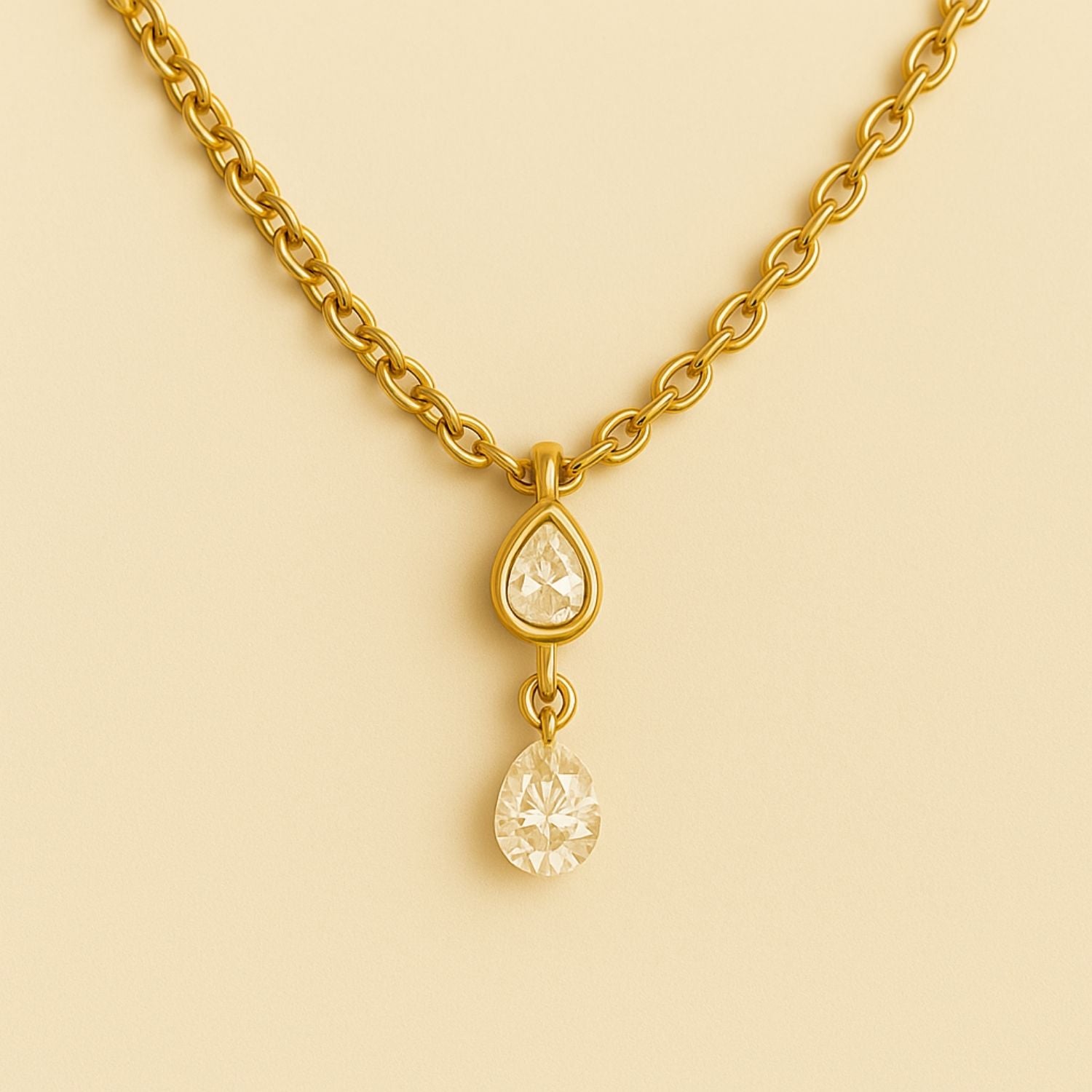 Two D colour, internally flawless diamonds are poised in harmony: one cradled within a sculptural gold pear setting, the other suspended below, catching the light as you move.