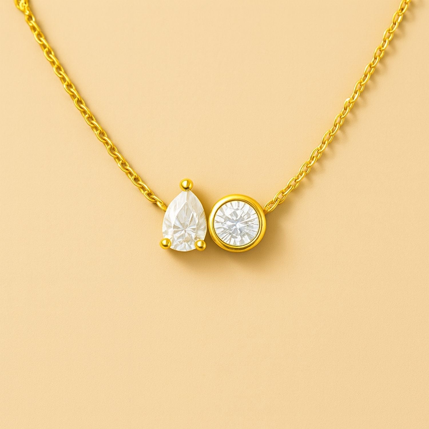 In this refined duo necklace, a pear-cut and a round brilliant diamond meet in quiet harmony, each reflecting a different facet of love and individuality.