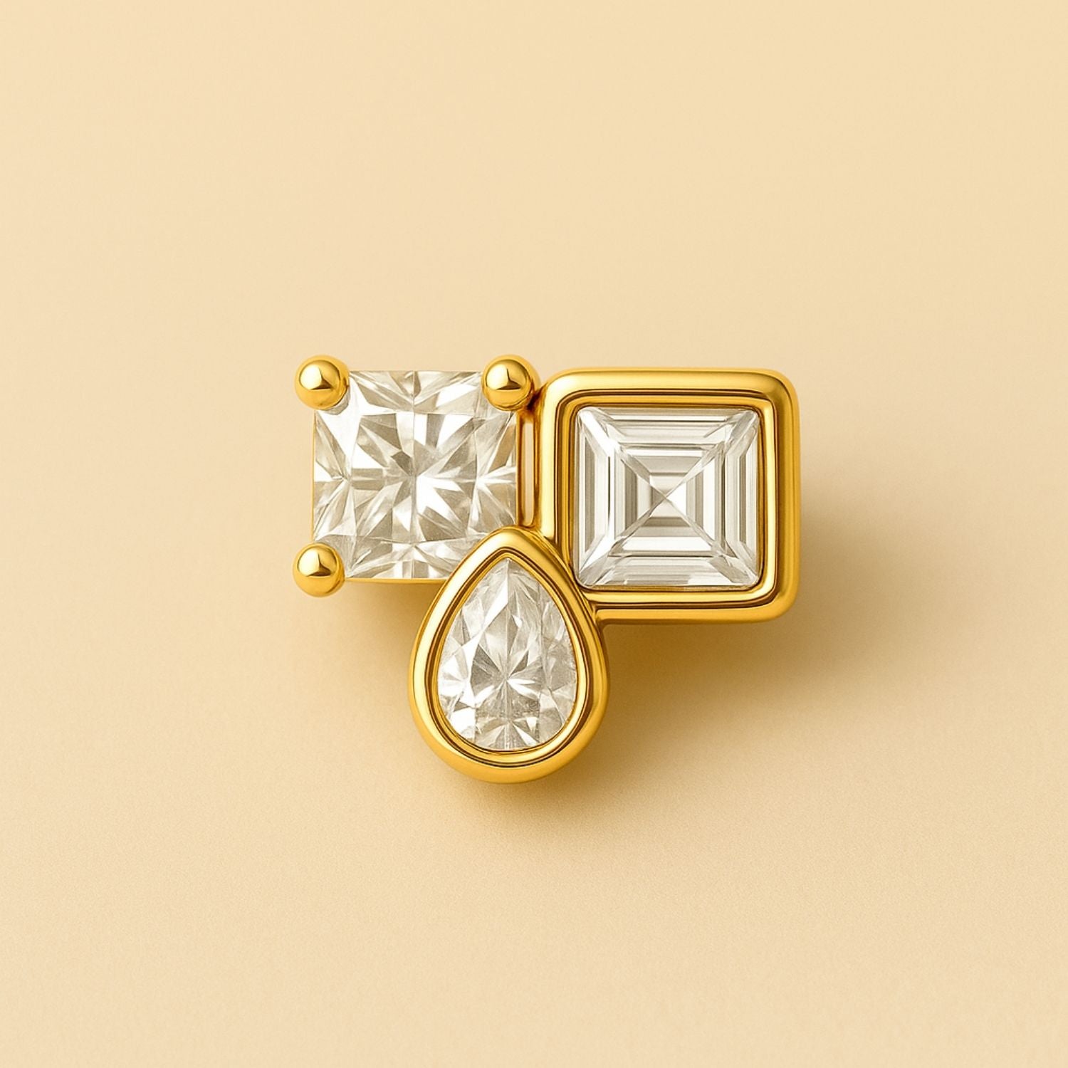 From the Entre Nous collection — meaning “between us” — this sculptural stud brings three diamond cuts into quiet conversation: princess, asscher, and pear.