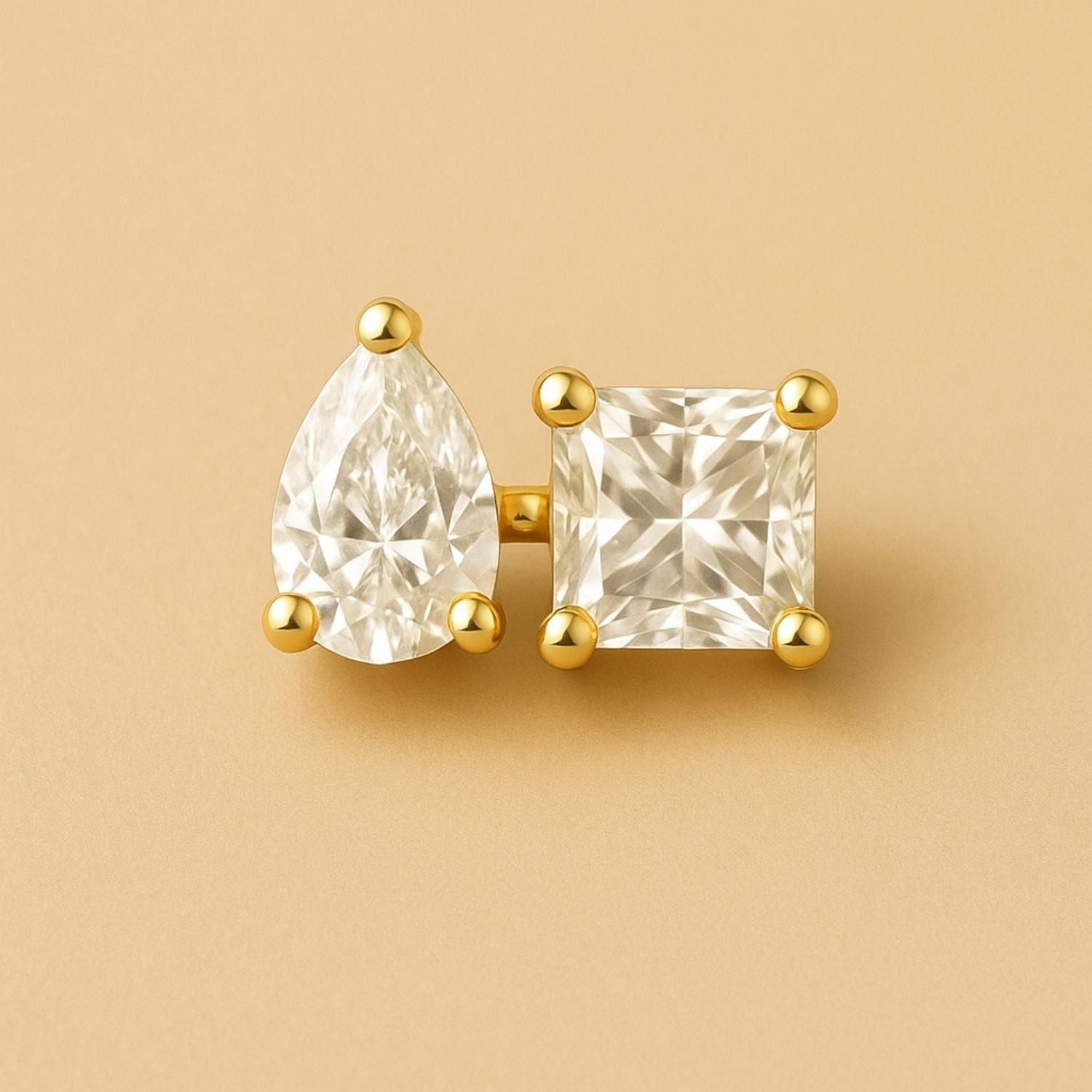 A pear-cut diamond and a princess-cut diamond sit side by side, their opposing shapes creating a quiet rhythm of precision and flow.