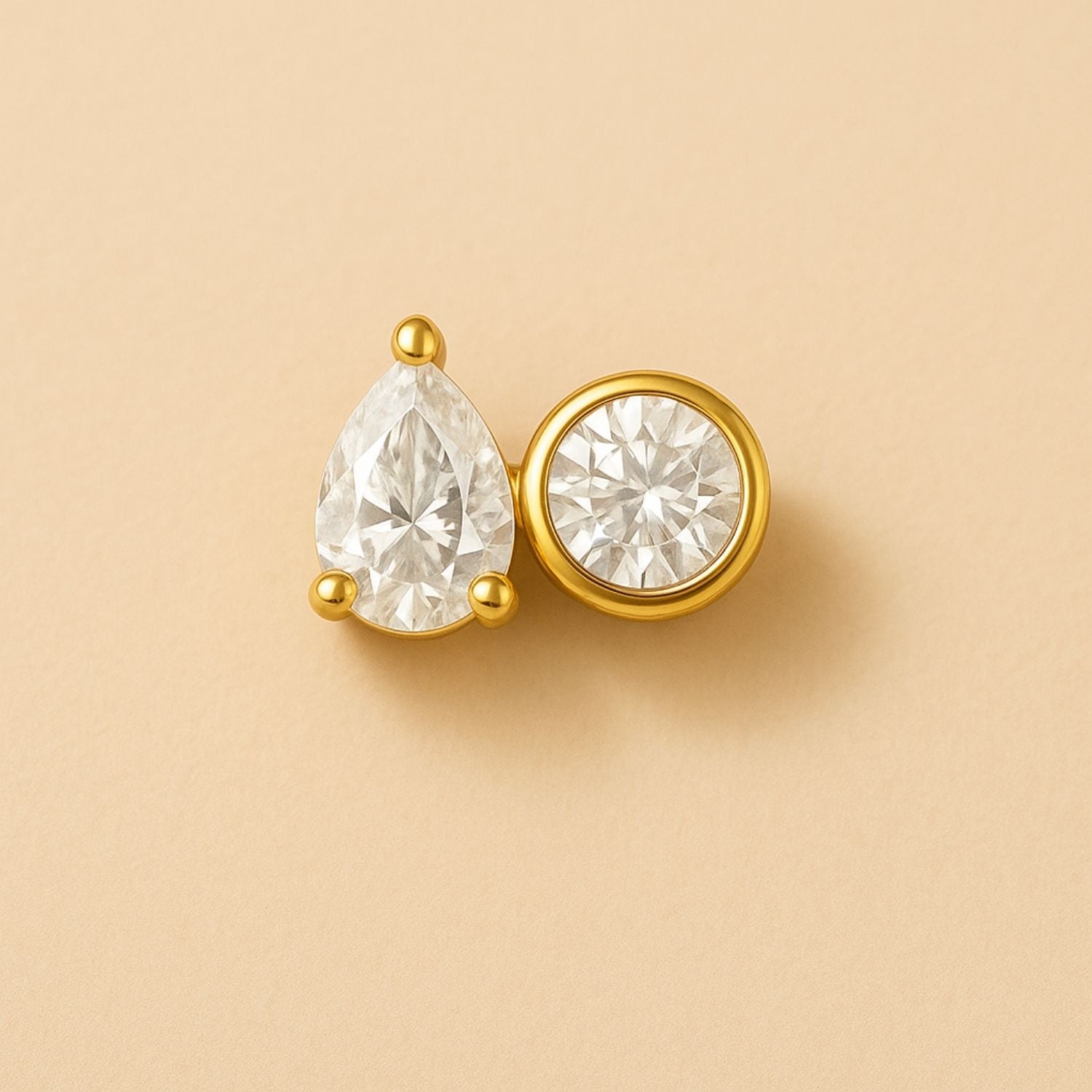 A round brilliant and a pear-cut diamond meet edge to edge, held within sculptural gold. Their asymmetry creates quiet rhythm — one gleaming with precision, the other with emotion.