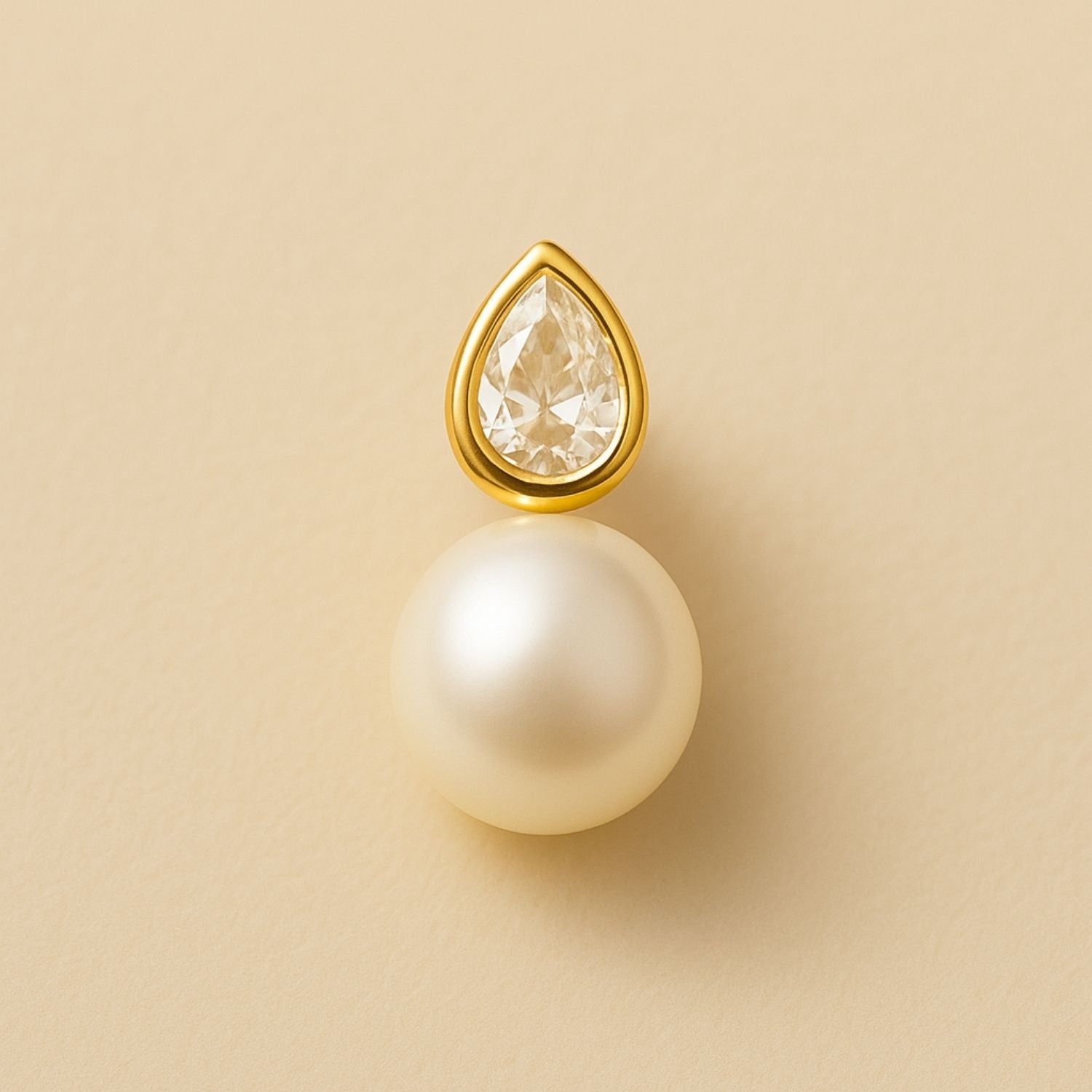A glowing pearl anchors the form, while a pear-cut diamond floats above in smooth gold. The silhouette recalls a teardrop — a moment of tenderness made eternal.