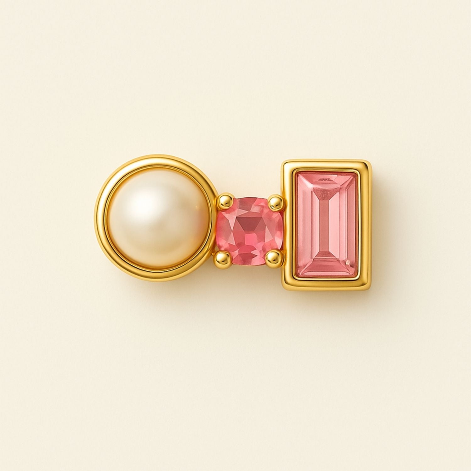A round pearl, a cushion-cut pink tourmaline, and a baguette-cut pink tourmaline align in delicate proportion, forming a composition that’s both architectural and tender.