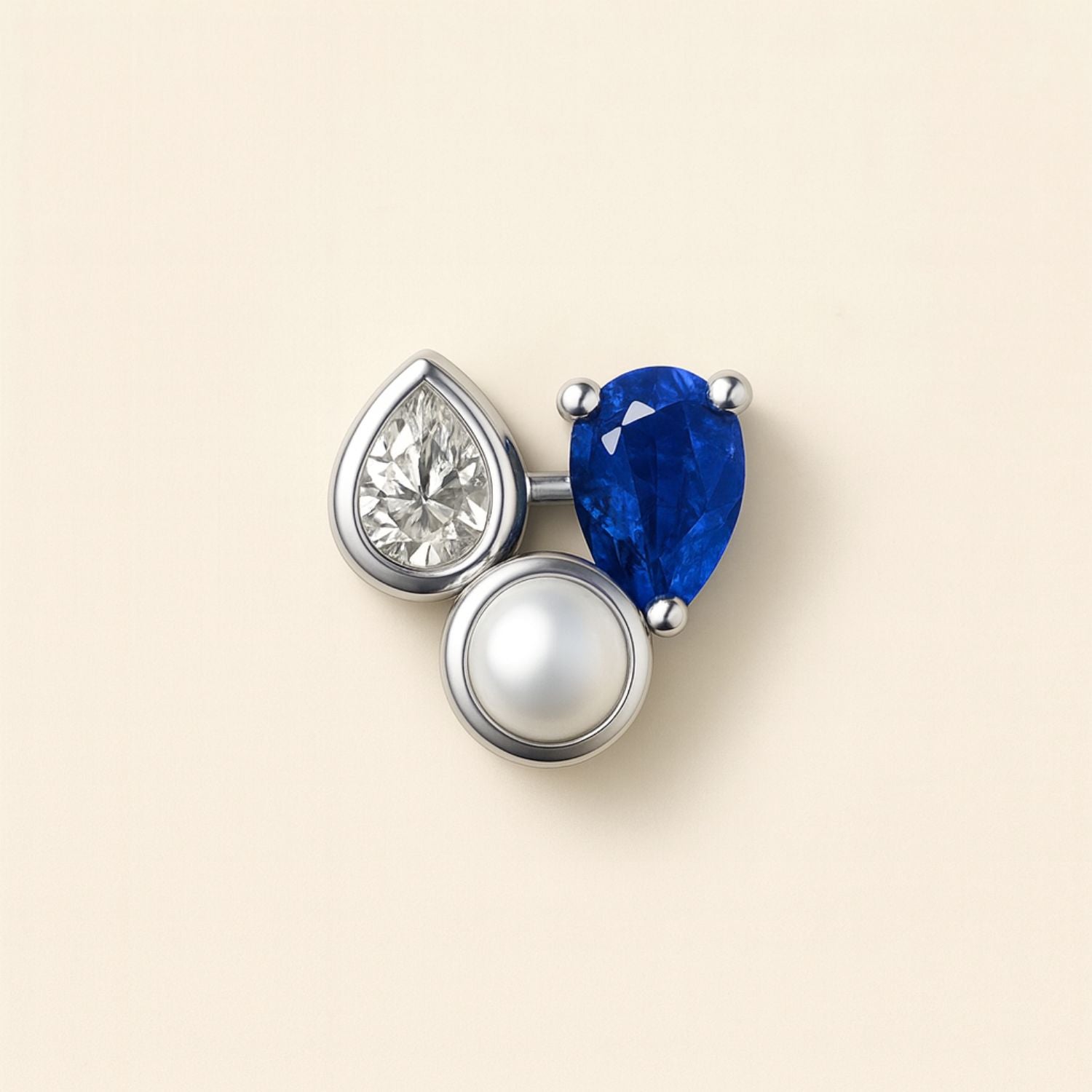 A deep blue sapphire, a glowing pearl, and a bright diamond form a quiet constellation — three elements bound together in silver rhythm.