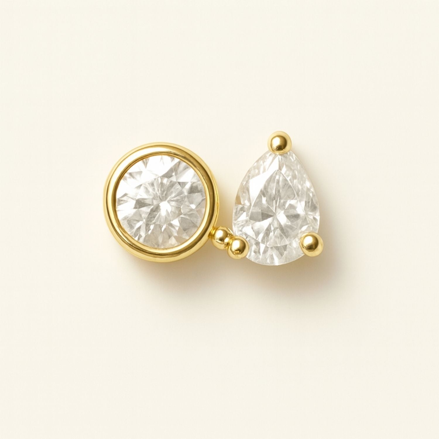 Two diamonds — one round, one pear — nestle side by side in 9ct gold, their contrast revealing a shared brilliance.