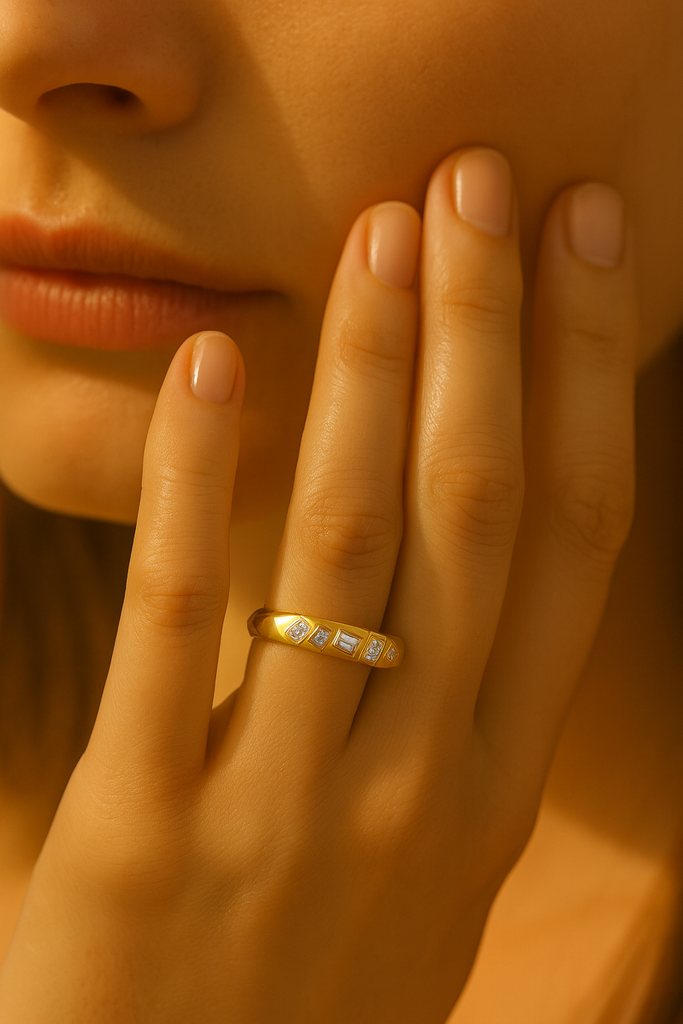 The Facet Flow Ring is an ode to light — a sculptural gold band set with an asymmetric rhythm of baguette, princess, and pear-cut diamonds that shimmer like shifting reflections.