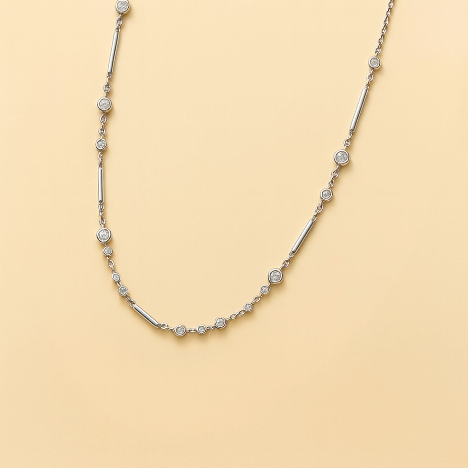 The Light Line Diamond Bar Necklace captures the quiet brilliance of light in motion. Sleek polished silver bars alternate with bezel-set lab grown diamonds, creating a refined rhythm that shimmers softly across the neckline.