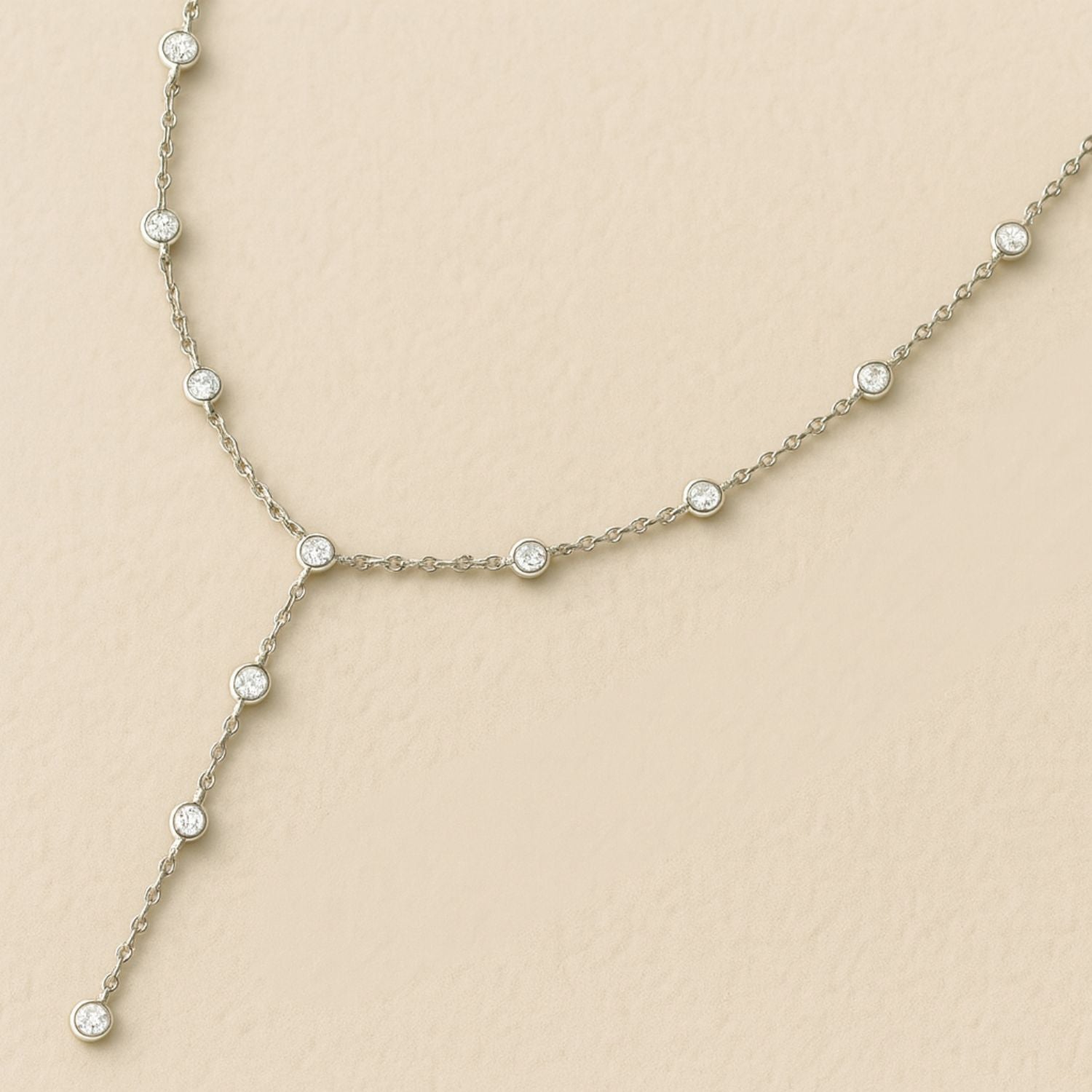 The Light Thread Diamond Lariat Necklace traces light across the skin in a gentle vertical flow. Lab-grown diamonds, each precision-set in polished sterling silver bezels, shimmer like suspended droplets along a fine chain.