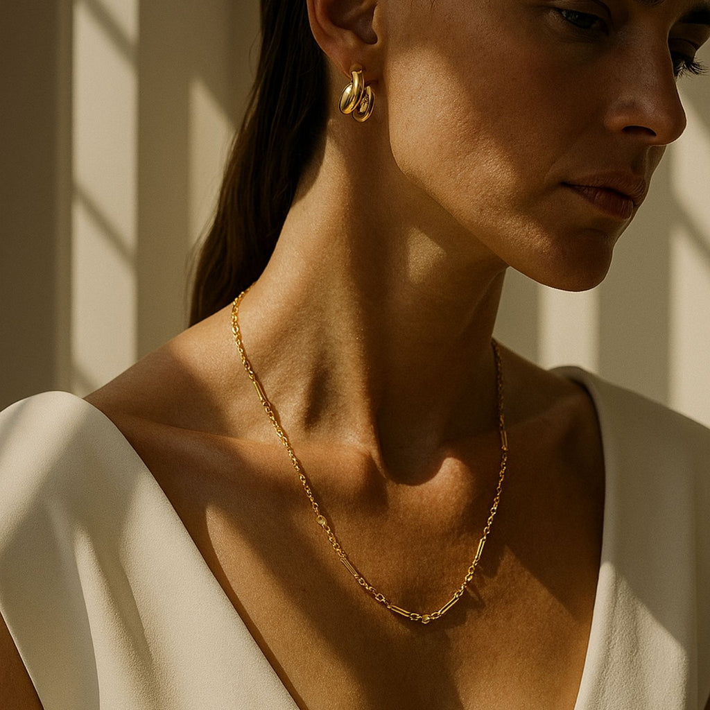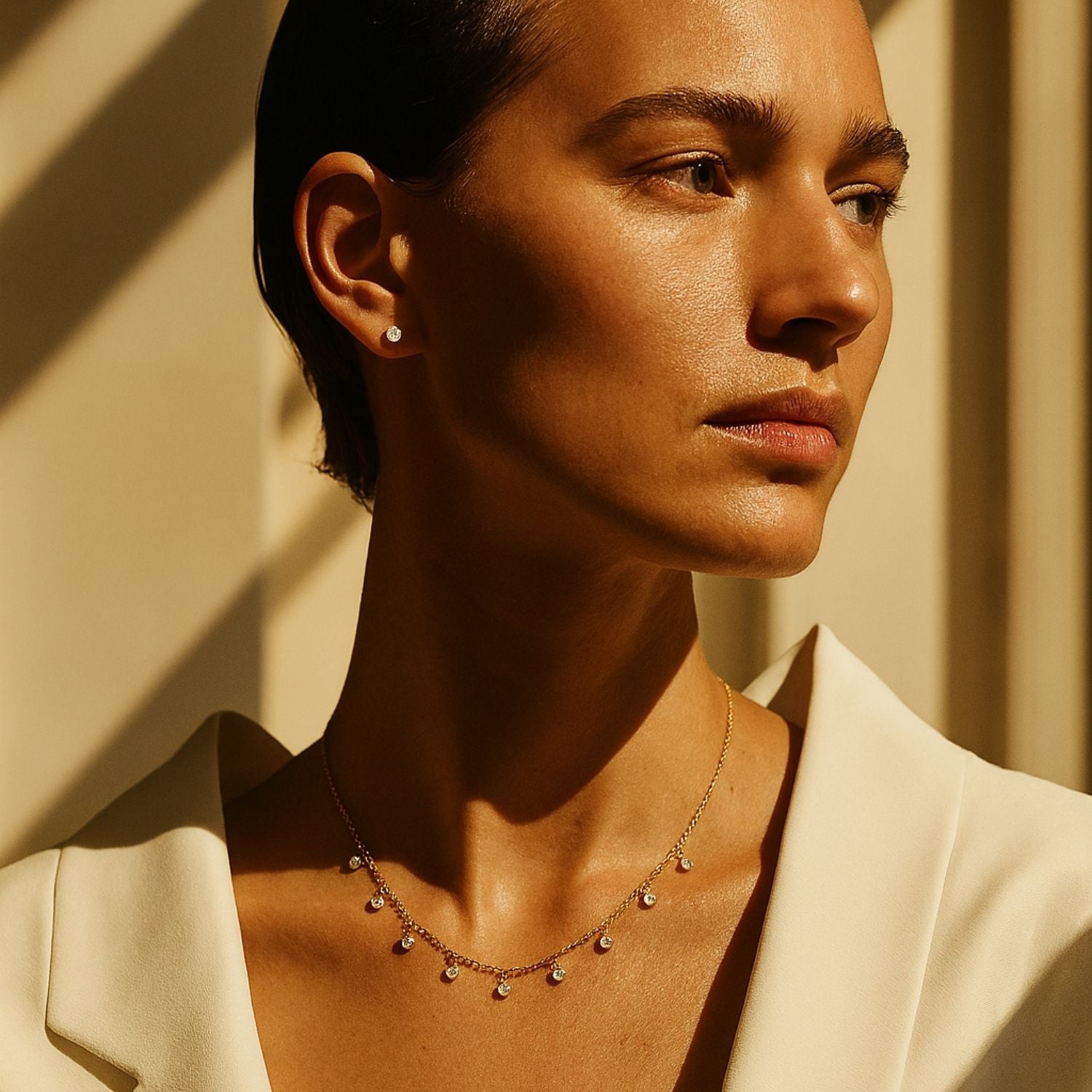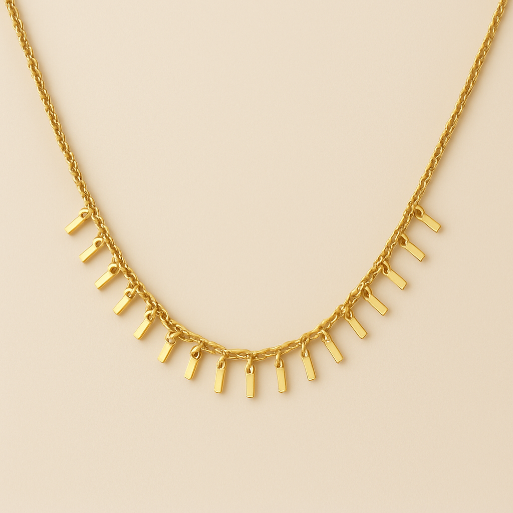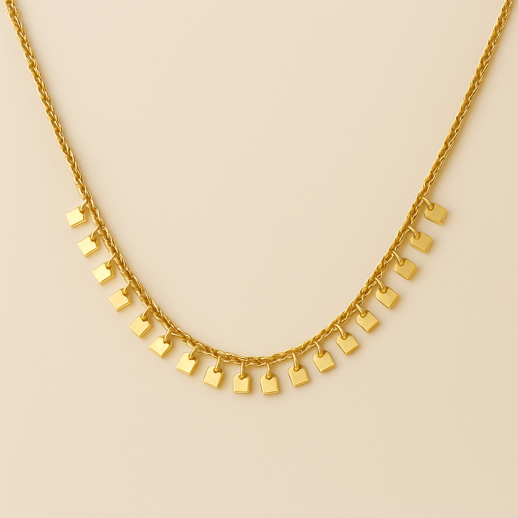 The Stardust Prism Necklace captures light through form — each small gold square catching a glint as it moves. The repetition creates a quiet shimmer, like reflections on calm water. Designed for fluid movement and graceful energy, this necklace translates the Stardust language of light into a more geometric rhythm — confident, refined, and luminous.