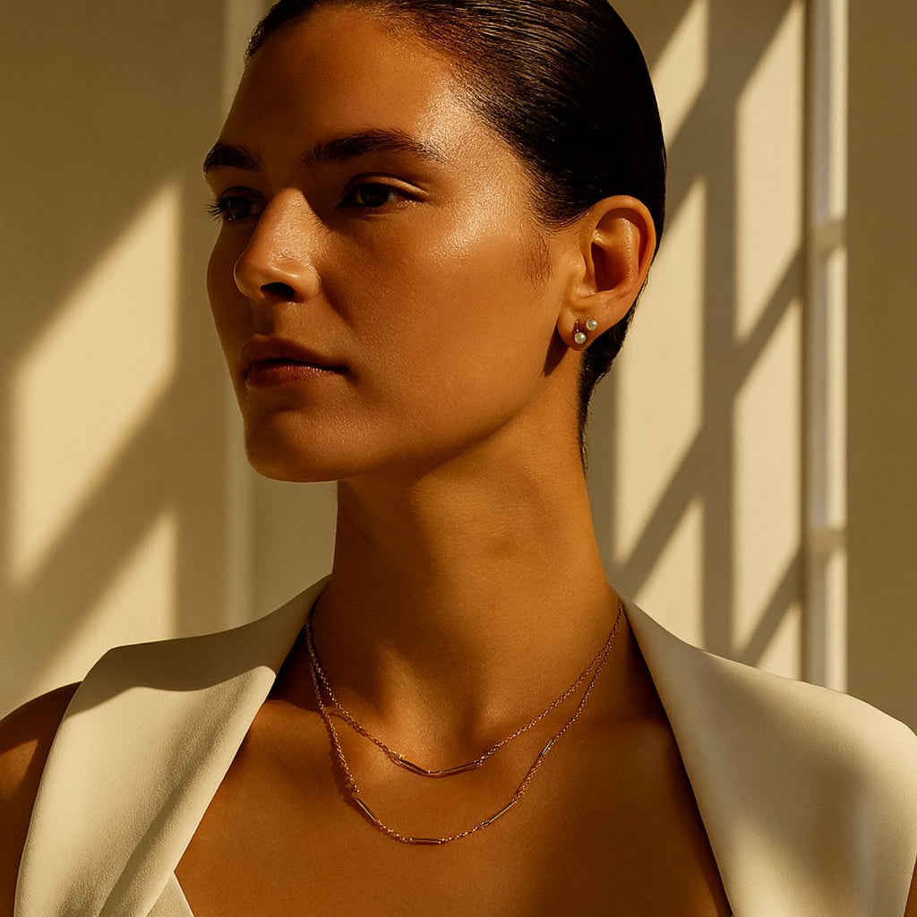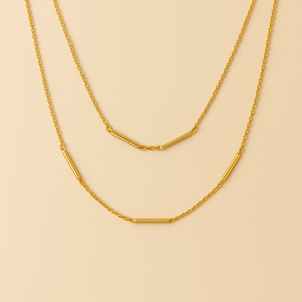 Like golden beams suspended in air, the Stardust Bar Necklace captures the quiet poetry of light in motion. Each slender bar glows softly against the skin — a rhythm of reflection that feels both grounding and celestial.
