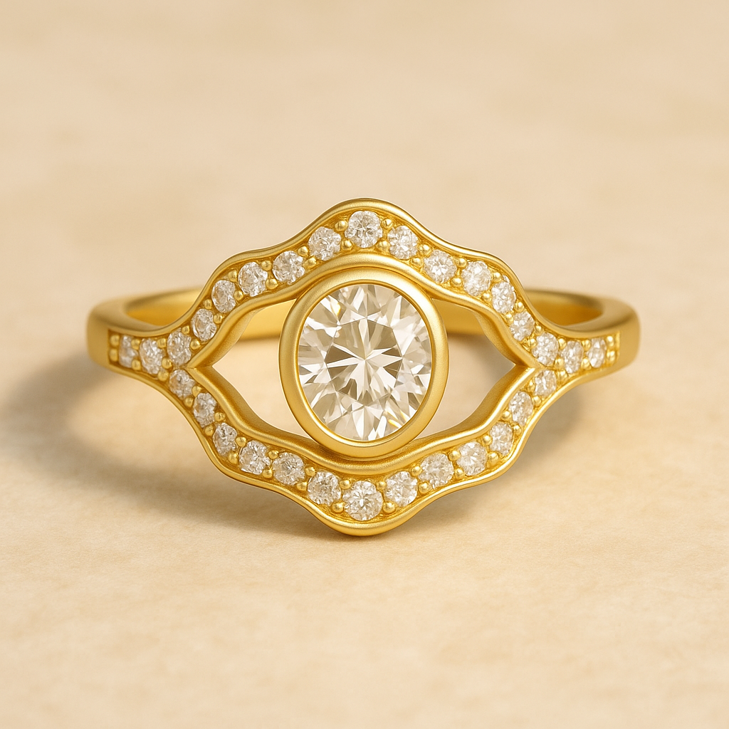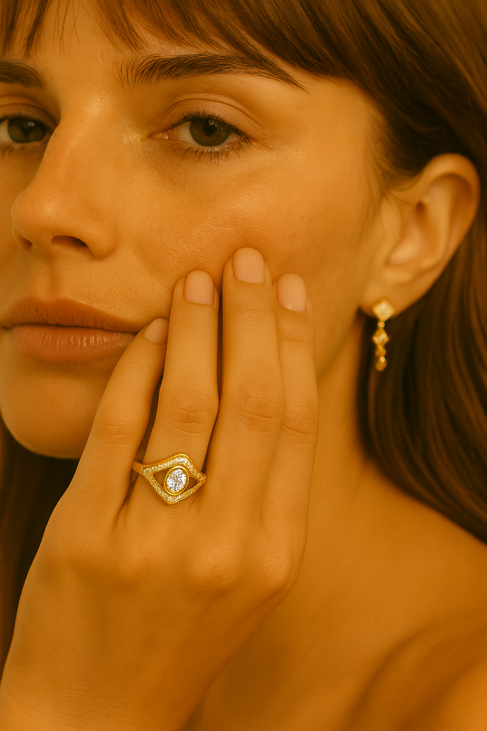 Cast in rich 18k recycled gold, the ring has a warm, satin lustre that feels both contemporary and ancient — as though uncovered from another world yet made for this moment. Every detail reflects Diana’s belief that jewellery should empower the women who wear it — as a symbol of strength, self-expression, and emotion made visible.