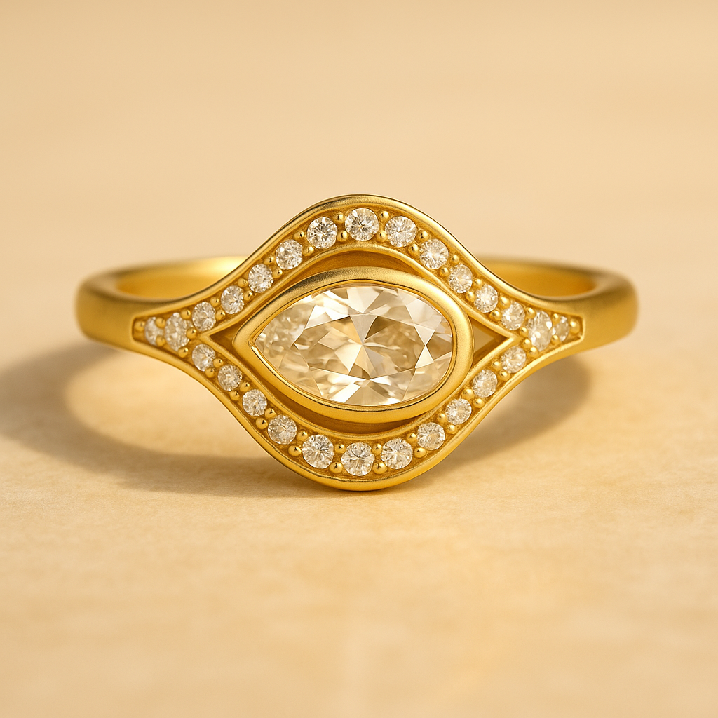 The Golden Radiance Ring by Lily Flo Jewellery is an ode to clarity — to the quiet power of knowing yourself and moving through the world with purpose. Its elongated marquise diamond, framed by an undulating halo of light, captures both strength and softness — a harmony of edges and curves that speaks to modern femininity.