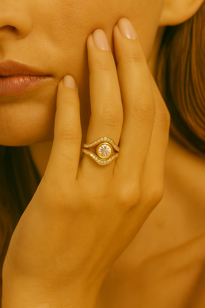 Designed by Diana Sherling, each piece begins as a hand-carved wax form, sculpted intuitively before being digitally refined in CAD to achieve its effortless fluidity. The central round brilliant diamond — a symbol of truth and clarity — is encased in a sculpted bezel, embraced by two softly curving pavé diamond bands that mirror one another in perfect balance.