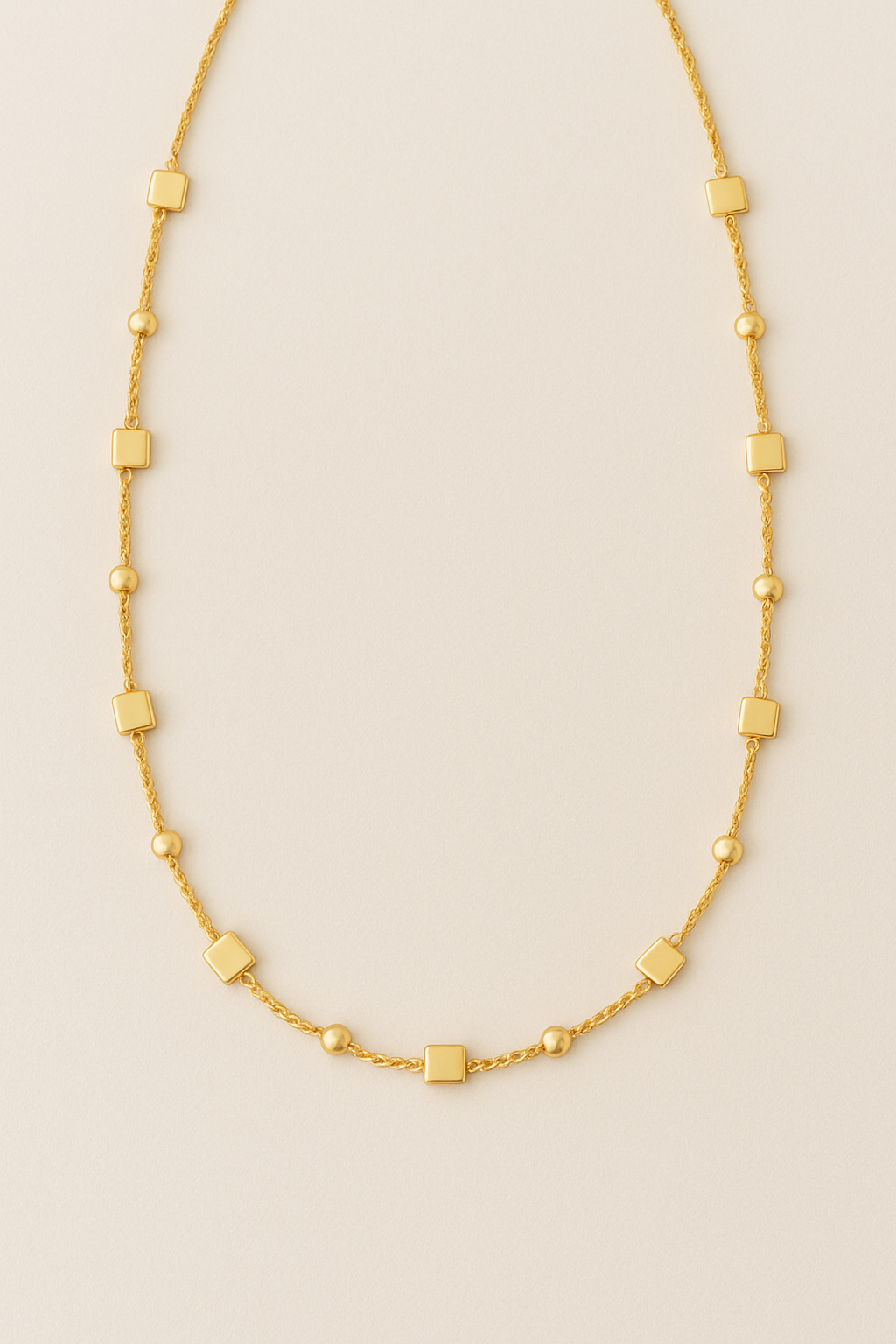 Alternating gold spheres and squares along fine gold chain