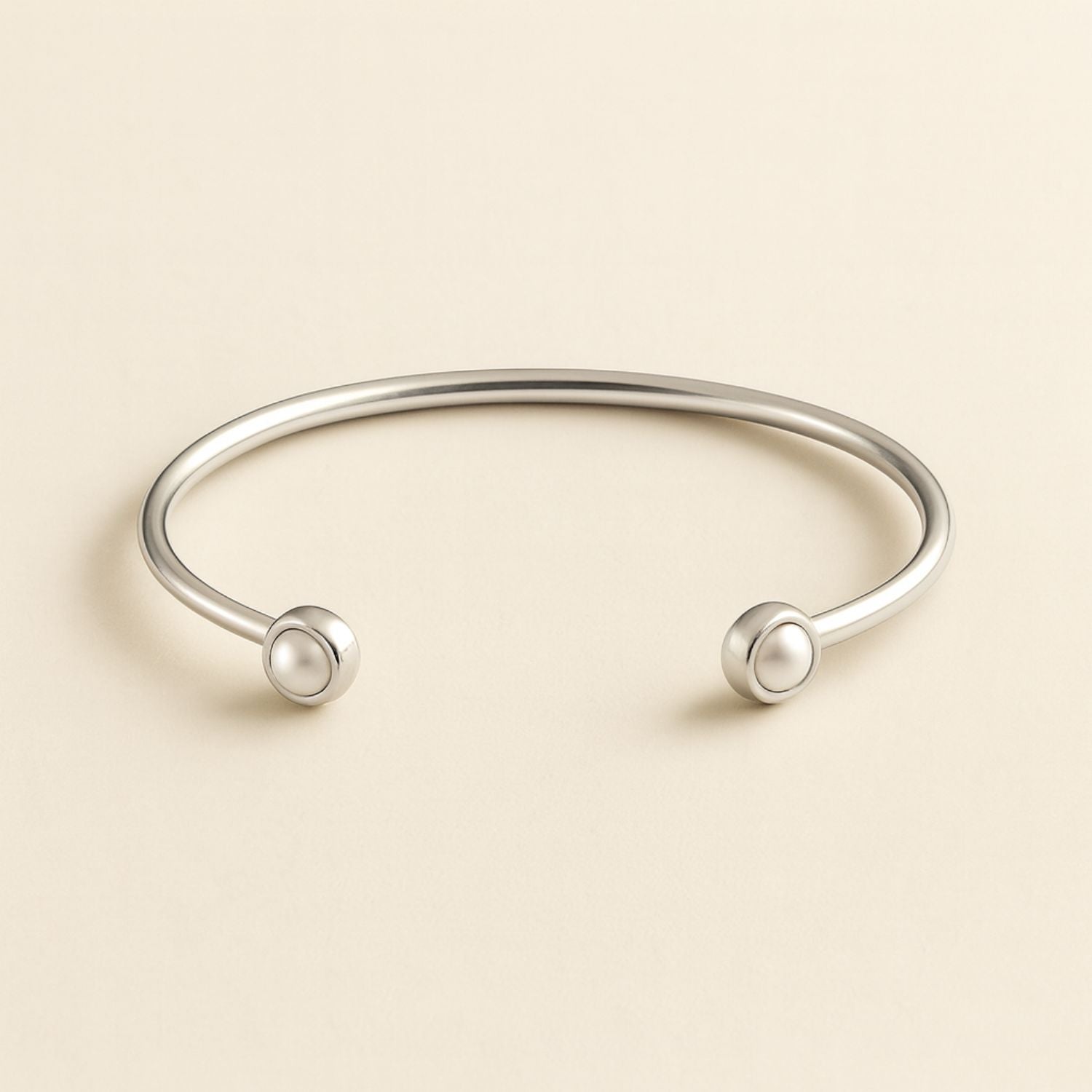 The Stardust Pearl Cuff is a study in proportion and grace — two luminous pearls held in a perfectly balanced, open-ended form. Handcrafted from solid recycled sterling silver, its unplated finish offers a quiet, natural glow that feels effortlessly modern.