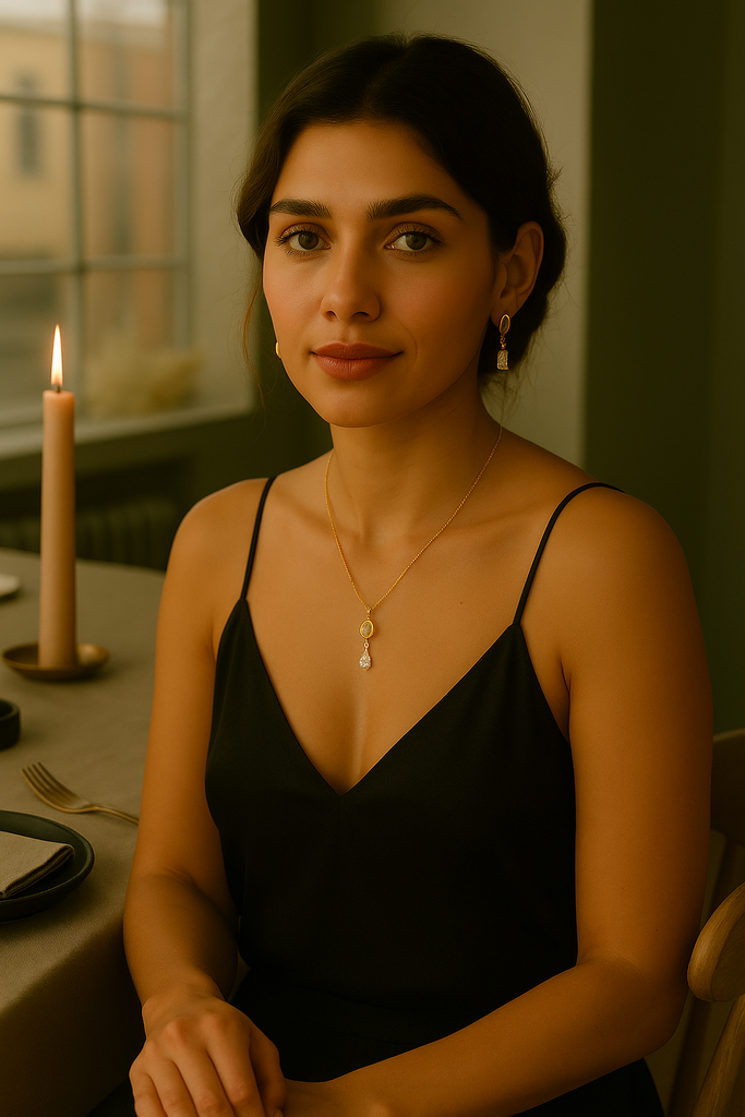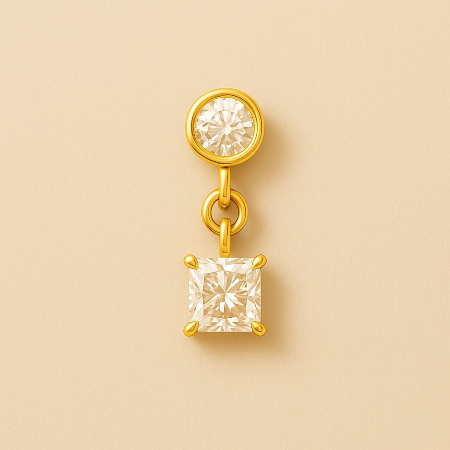 Two sustainably created diamonds — one round, one princess-cut — are linked in a fluid composition of light. Suspended from a polished gold hinge, the lower diamond dances gently as you move, creating a quiet rhythm between stillness and flow.