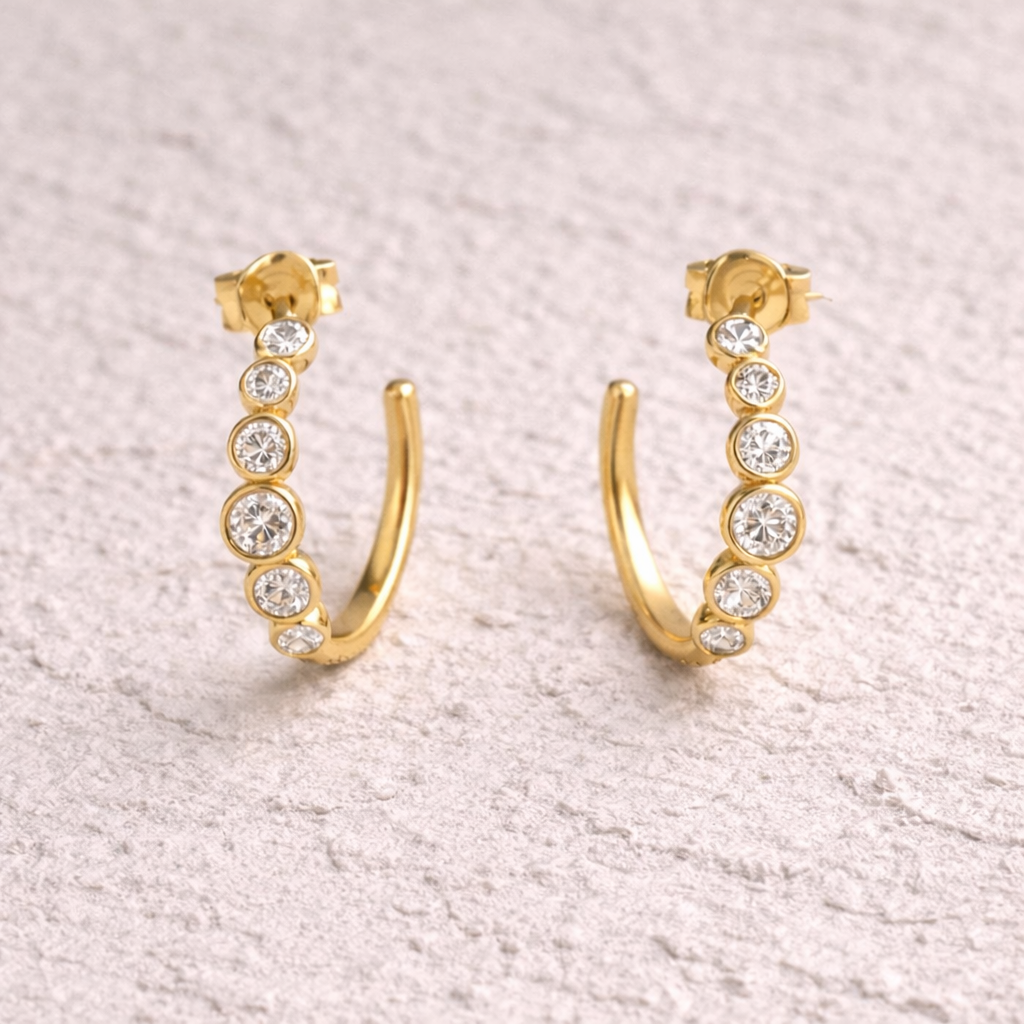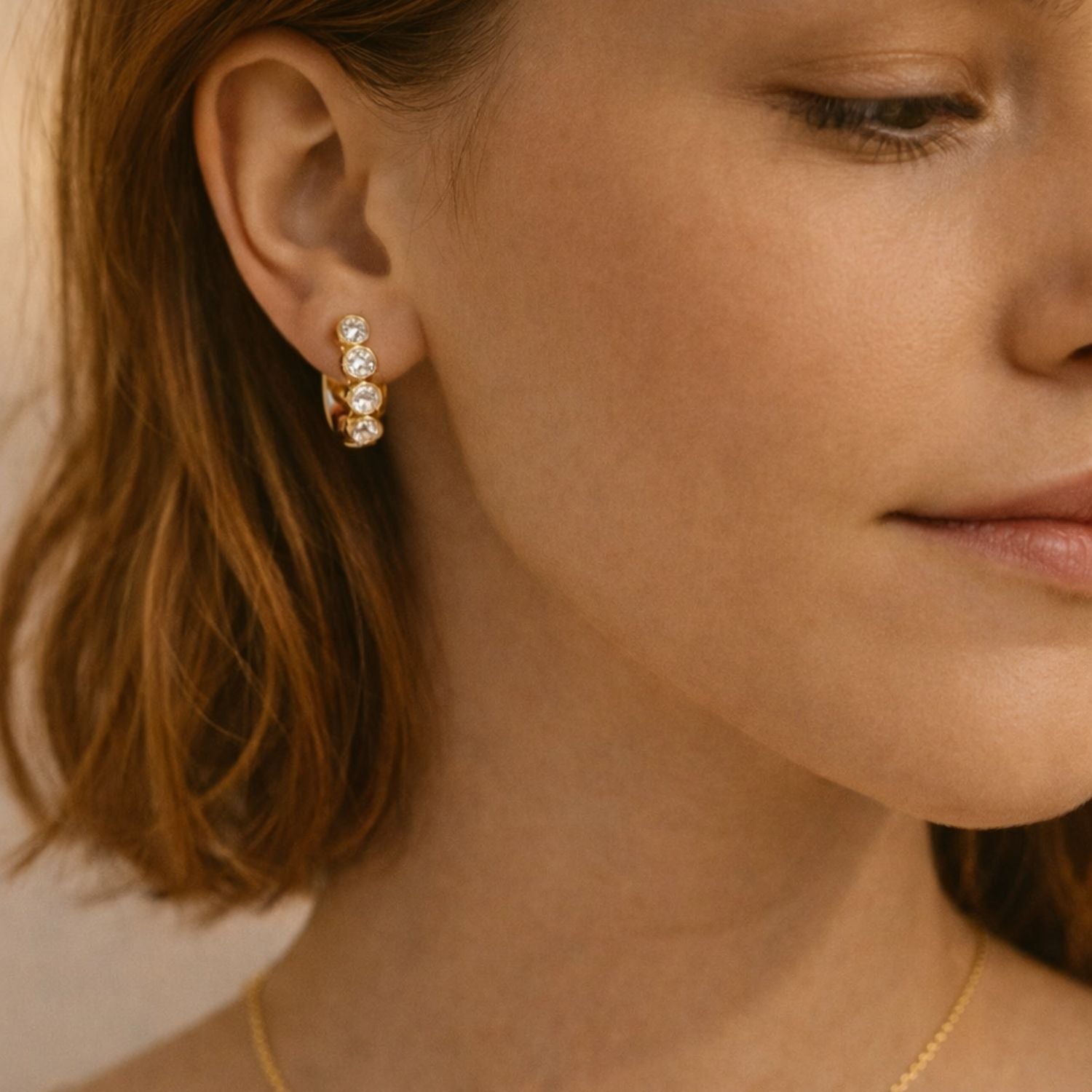 The stones follow the natural line of the ear, creating a continuous flow of light. The bezel settings soften the structure, giving the piece a more modern and fluid feel than traditional pavé.