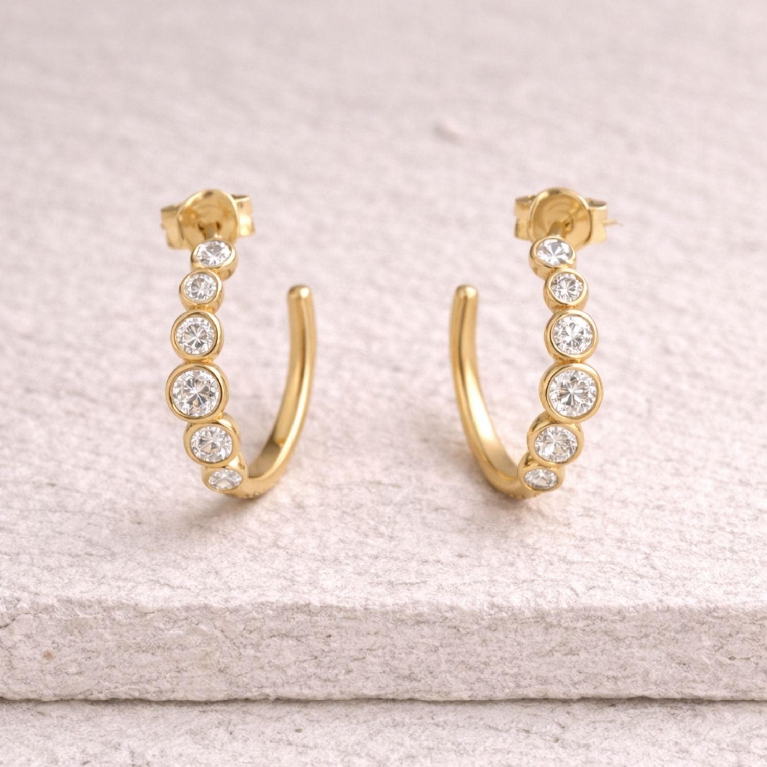 The Aurora Diamond Bezel Hoops are set with a sequence of round brilliant diamonds, each individually framed in gold and arranged along the front curve of the hoop.