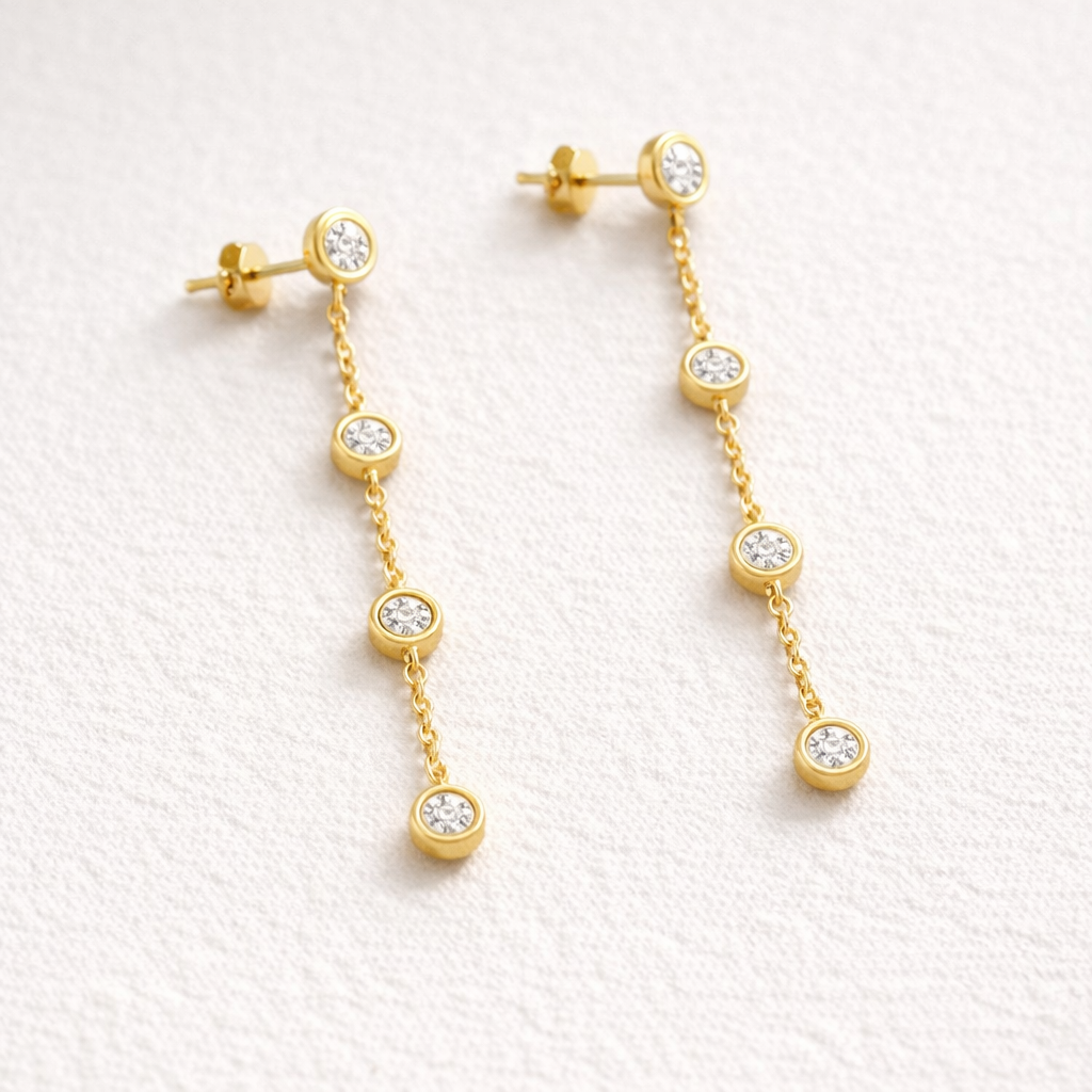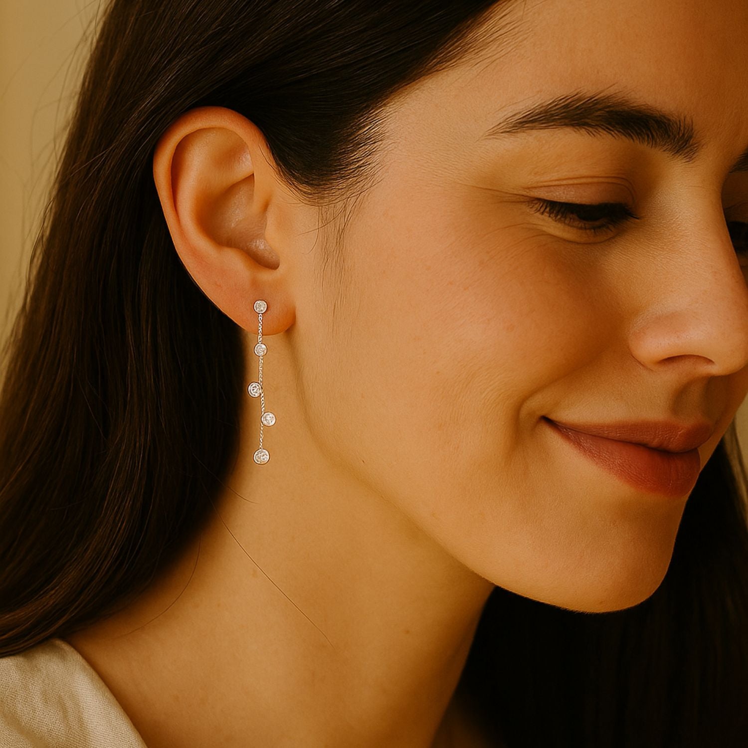 The Aurora Diamond Cascade Earrings feature a sequence of bezel-set diamonds suspended along a fine gold chain, creating a soft vertical line of light.