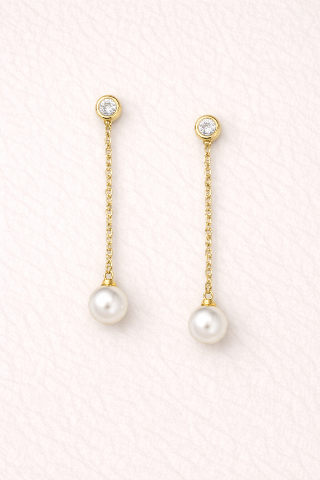 The Aurora Diamond & Pearl Drop Earrings pair a single bezel-set diamond with a fine gold chain, leading to a softly suspended pearl. The composition is simple and elongated, allowing each element to move freely — catching light above, holding it below.