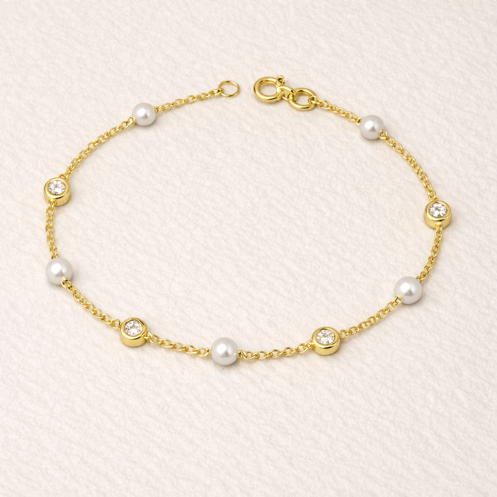 The Aurora Diamond & Pearl Station Bracelet is composed of alternating bezel-set diamonds and softly luminous pearls, spaced along a fine gold chain.
