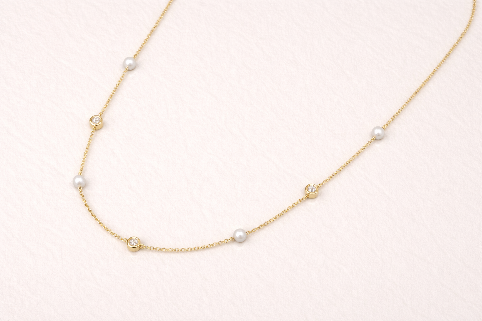 The Aurora Diamond & Pearl Station Necklace is composed of alternating bezel-set diamonds and softly luminous pearls, placed along a fine gold chain.