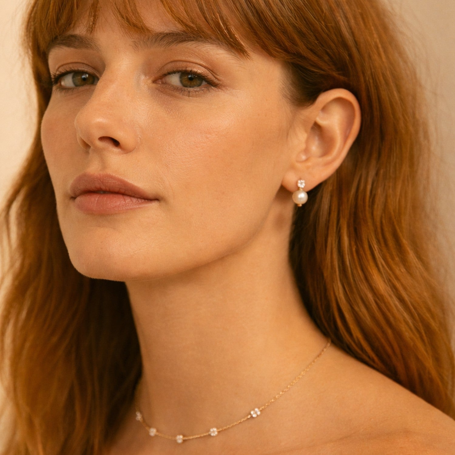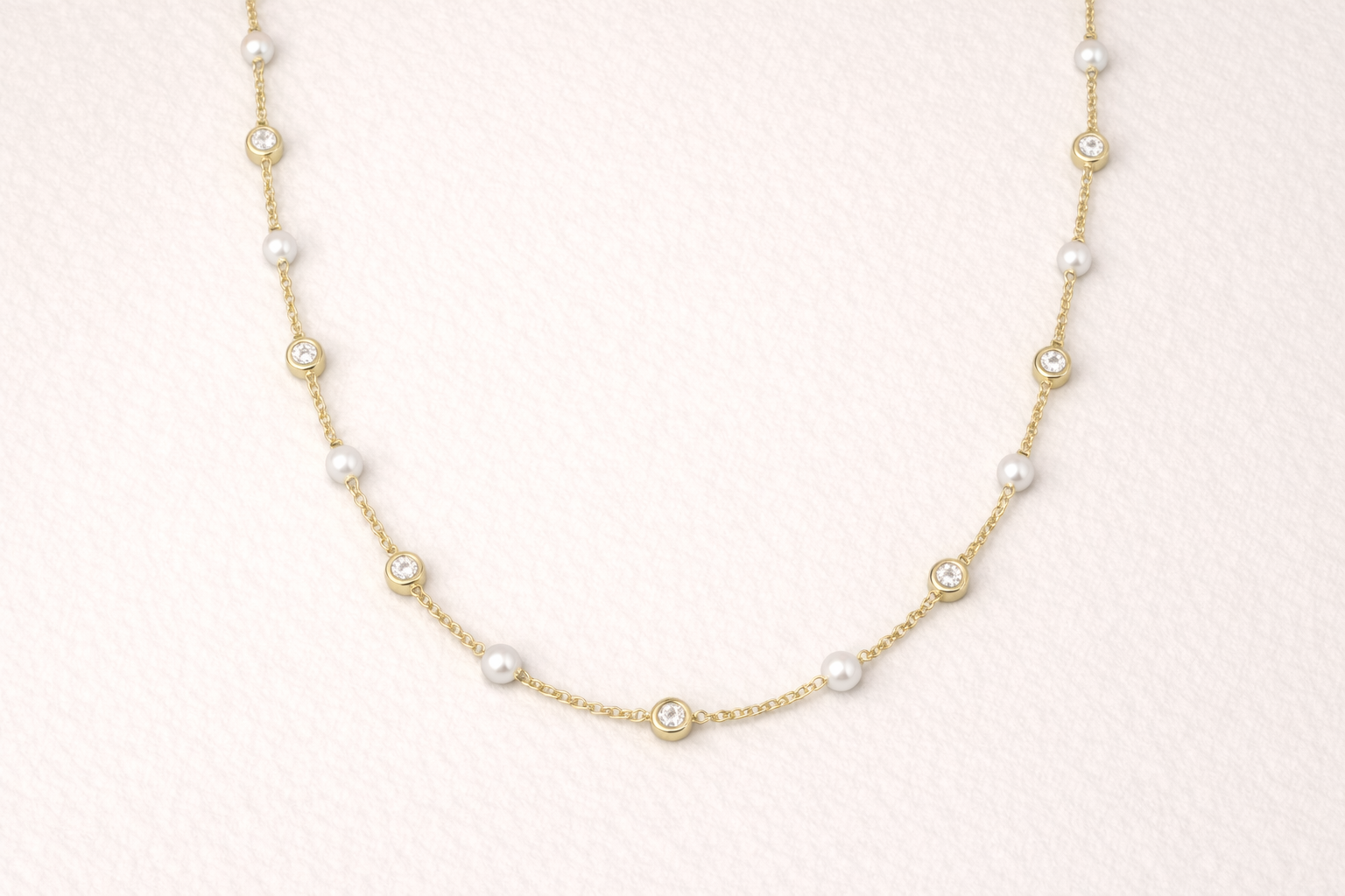 The Aurora Diamond & Pearl Station Necklace is composed of alternating bezel-set diamonds and softly luminous pearls, arranged in a continuous rhythm along a fine gold chain.