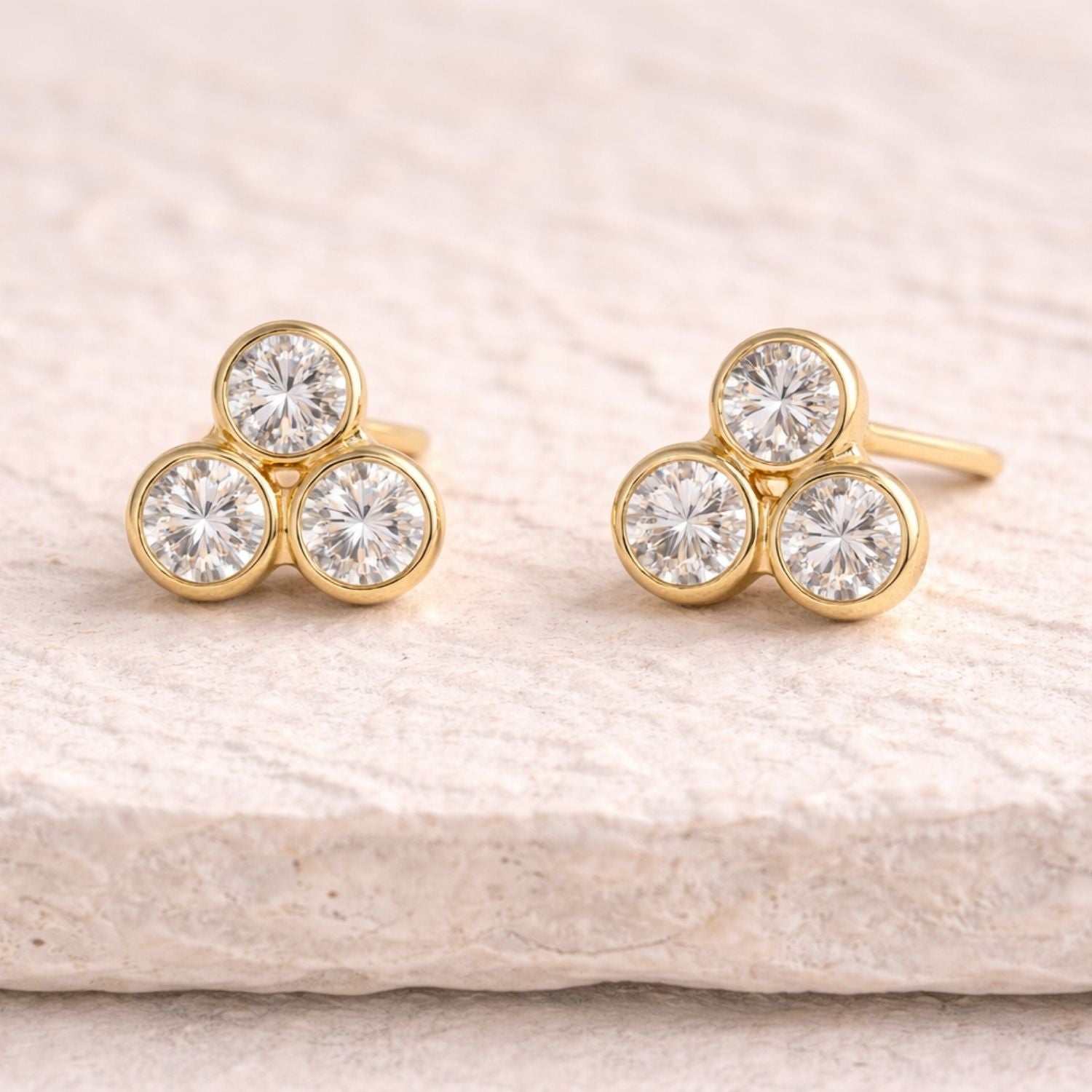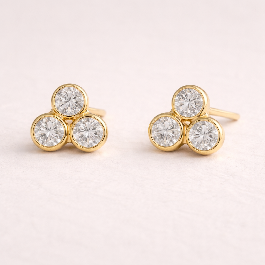 The Aurora Diamond Trio Studs bring together four bezel-set diamonds in a softly structured formation, creating a compact composition of light.