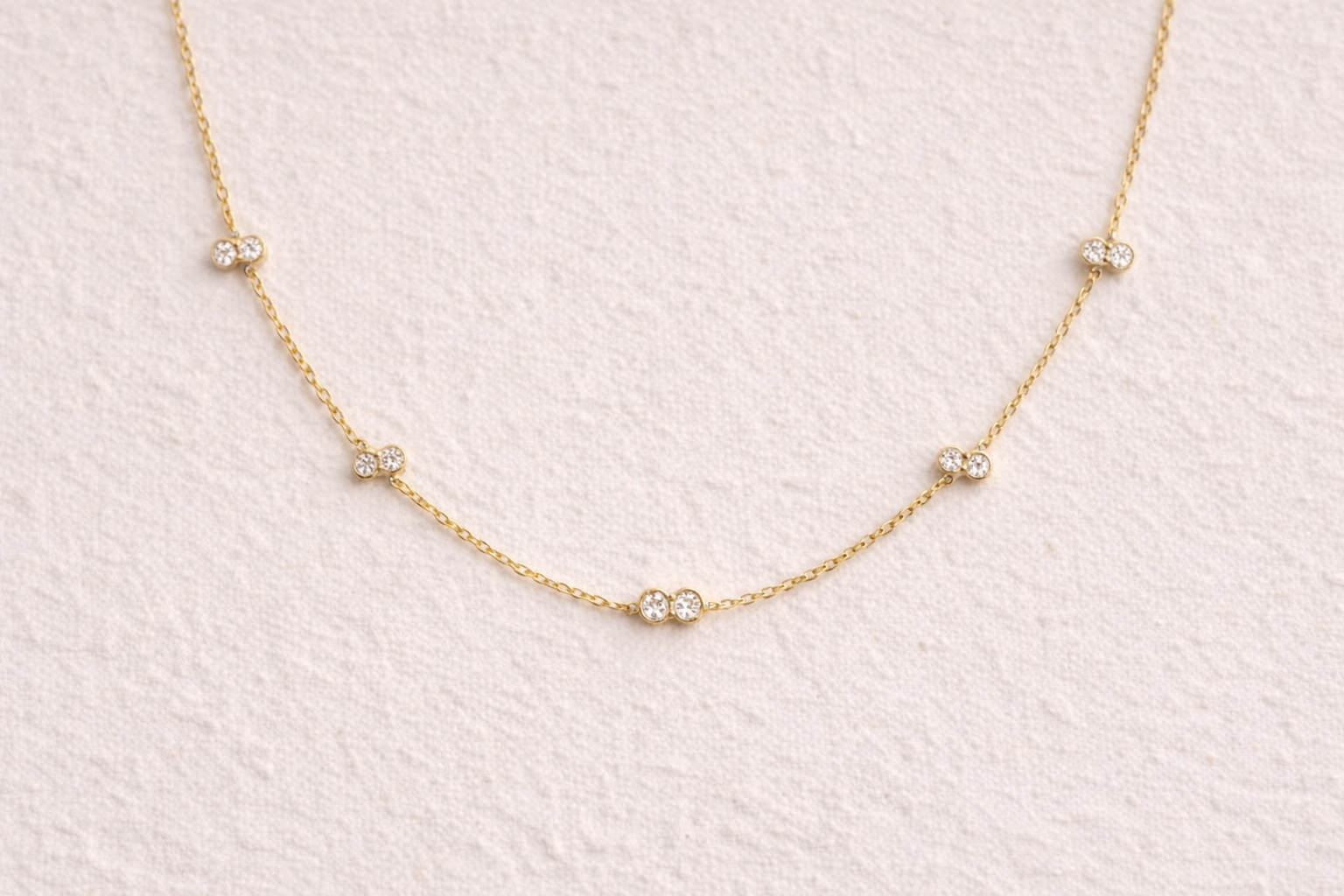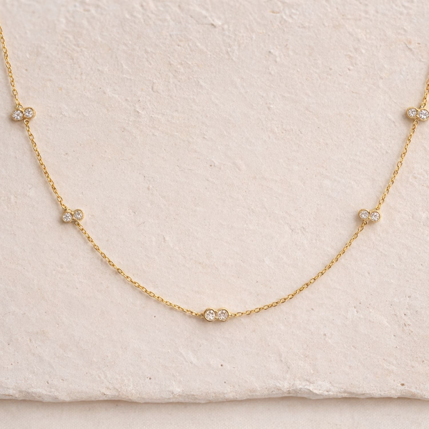 The Aurora Double Diamond Station Necklace features a series of paired bezel-set diamonds, spaced evenly along a fine gold chain.