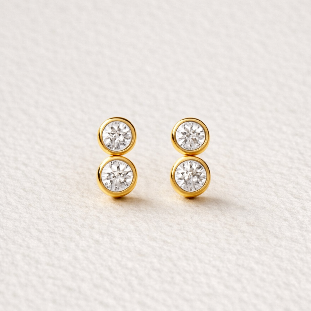 The Aurora Double Diamond Studs are formed from two round brilliant diamonds, set in smooth gold bezels and stacked in a clean vertical line. The silhouette is simple yet intentional — a quiet extension of the classic stud, designed to bring subtle structure and balance to the ear.