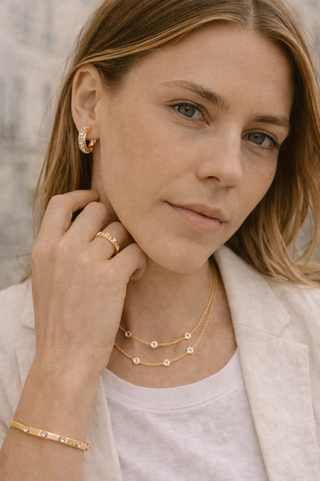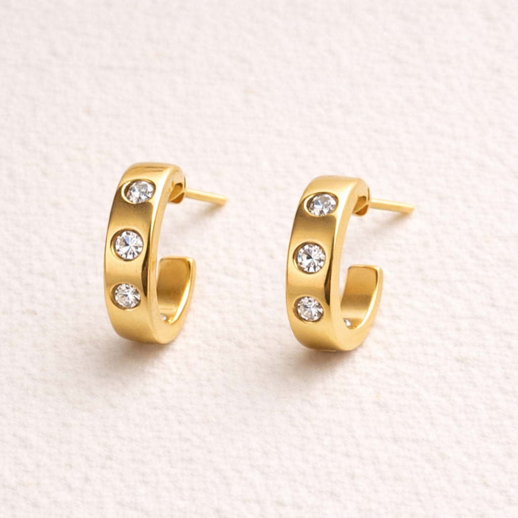- Three flush-set stones per earring