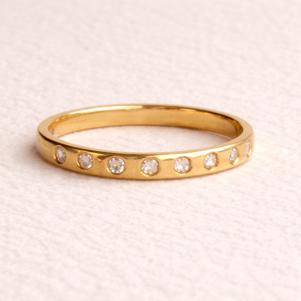 Brilliant-cut diamonds are evenly flush-set all the way around a softly sculpted gold band, creating a quiet rhythm that feels effortless rather than formal. The stones sit low into the gold, allowing the ring to catch the light gently while remaining comfortable for everyday wear.