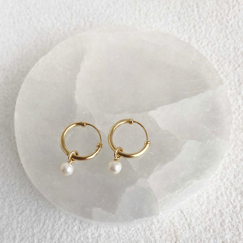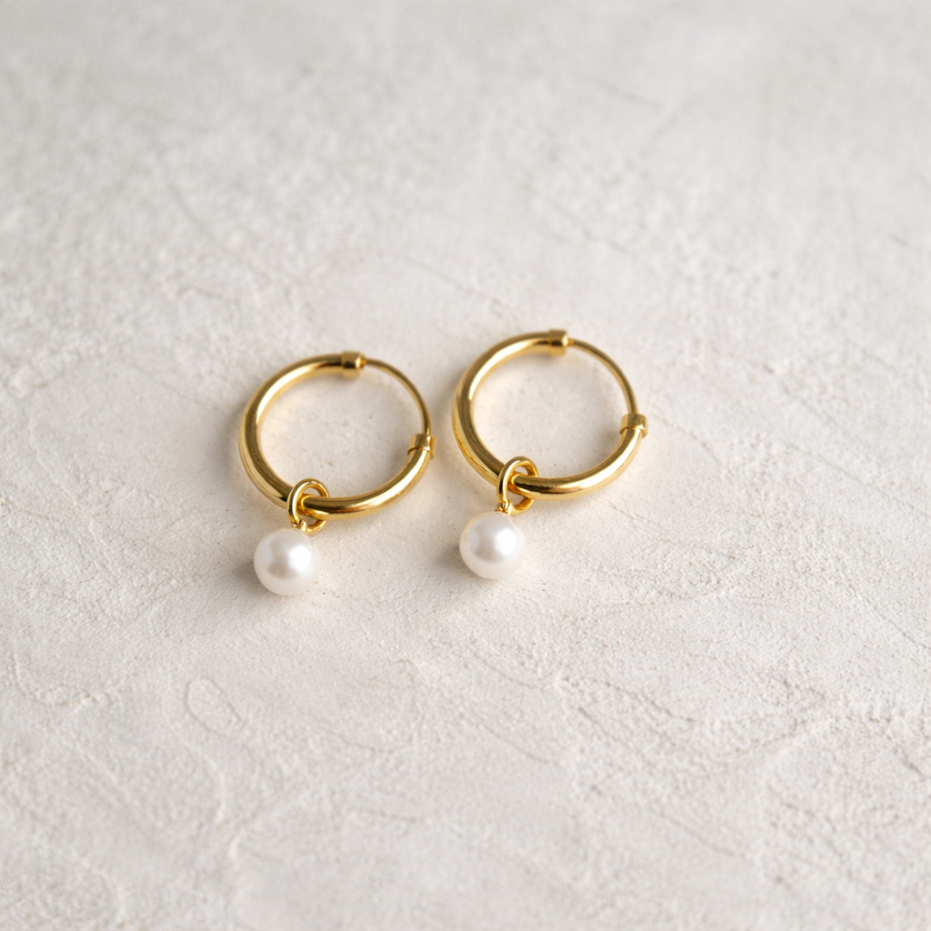 The Aurora Pearl Charm Huggies feature a polished gold hoop with a single suspended pearl charm. The form is simple and balanced, allowing the pearl to move freely while maintaining a clean, minimal silhouette.