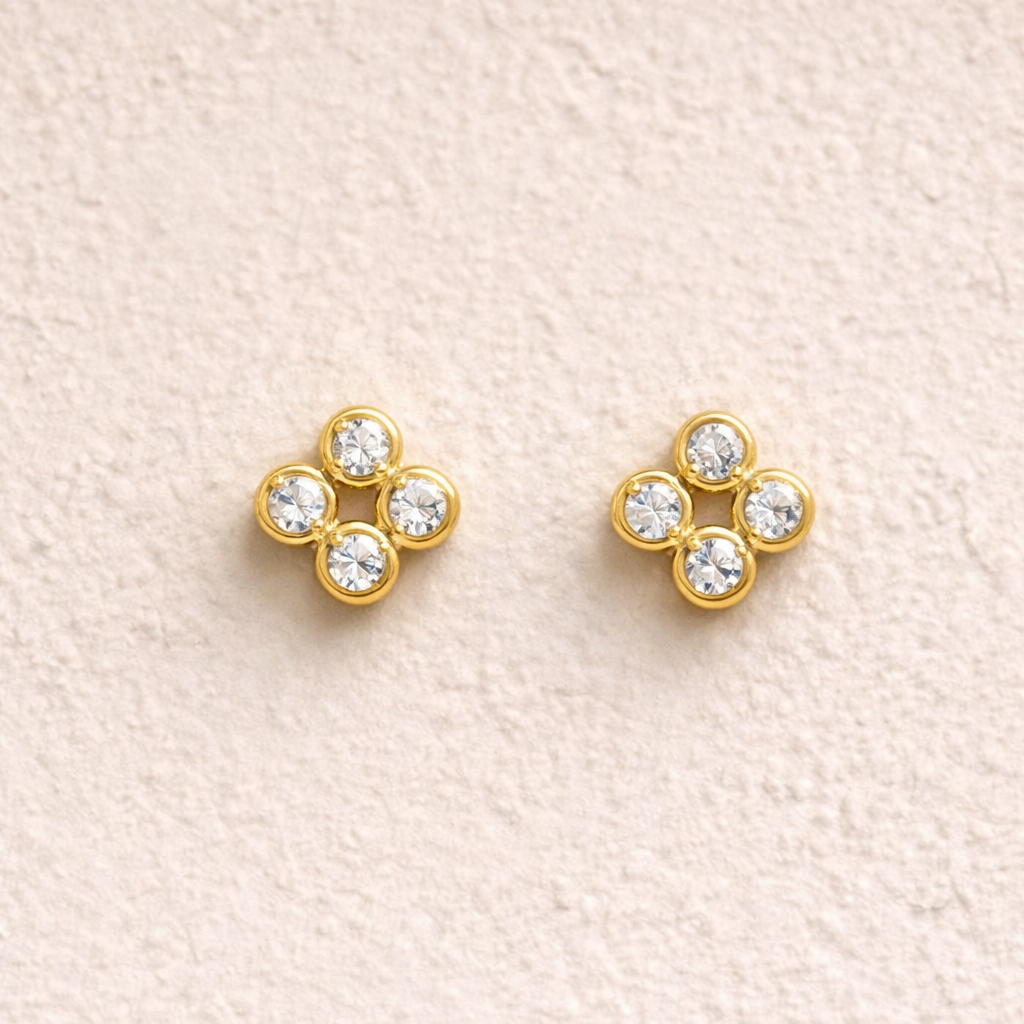 Each stud is handcrafted in solid gold and set with four brilliant white diamonds, bezel-set for everyday comfort and luminous sparkle. A quiet statement for those who move to their own rhythm.