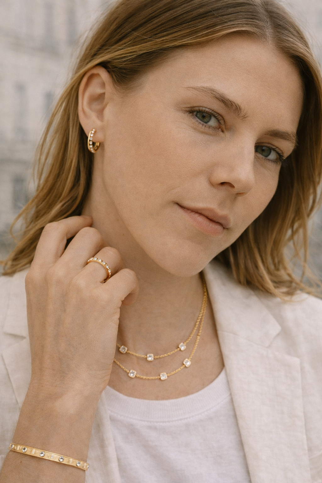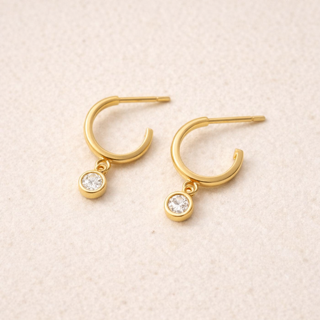 The Aurora Diamond Drop Hoops pair a softly rounded gold hoop with a single bezel-set diamond, suspended to move freely with the body. The effect is subtle yet luminous — a quiet flicker of light that shifts with every movement.