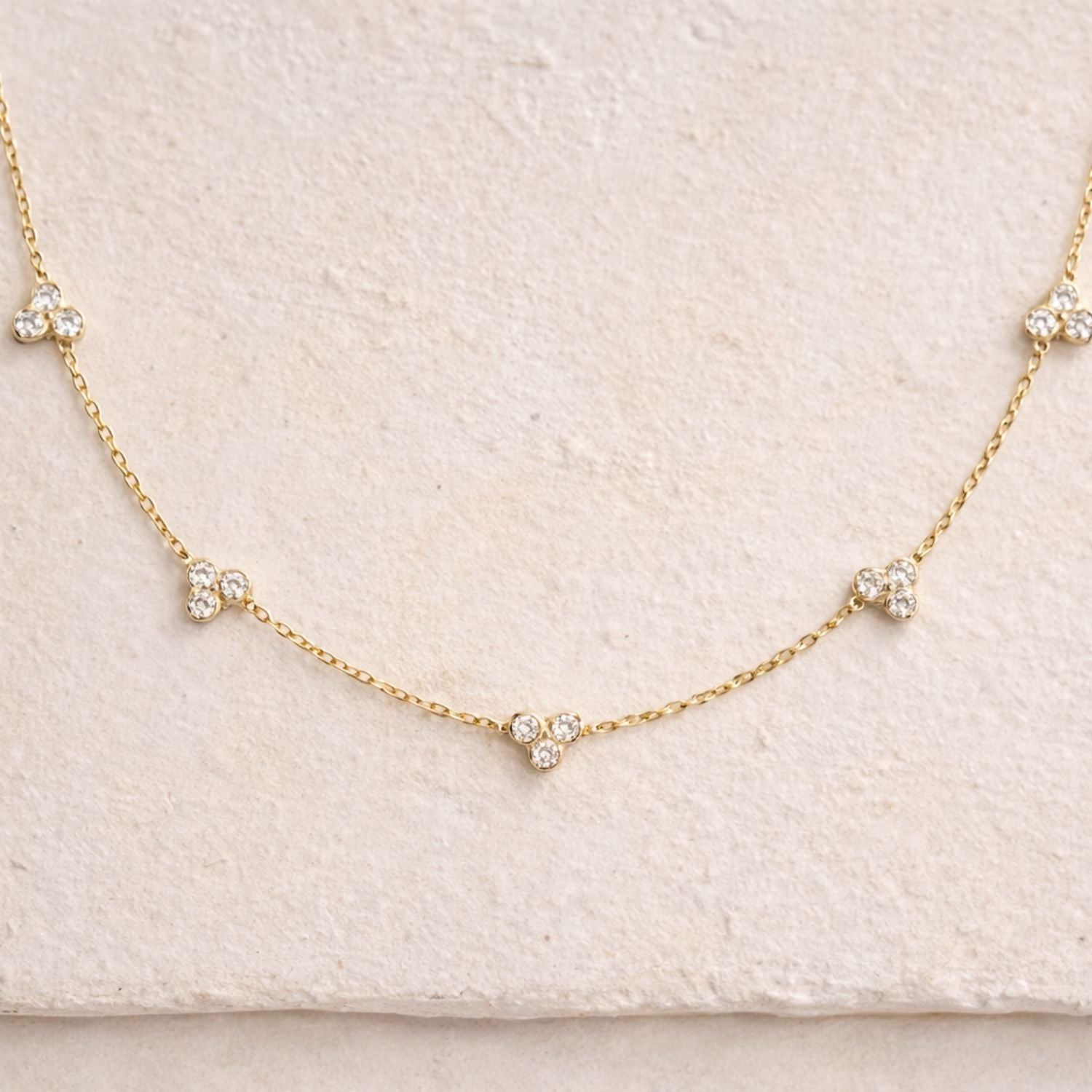 Spaced along a fine gold chain, each trio creates a subtle point of light, adding depth and quiet dimension across the neckline. The design feels balanced yet slightly more expressive than a classic station, offering a refined evolution of everyday diamond jewellery.