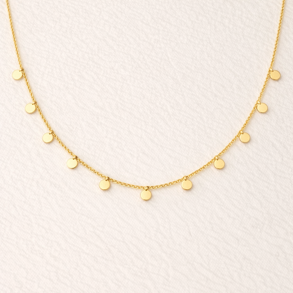 The Scattered Stars Necklace is the distilled essence of light — pure, refined, and endlessly wearable. Each polished gold dot catches the light like a quiet flicker of dawn, creating a smooth, unbroken rhythm of reflection along the neckline.