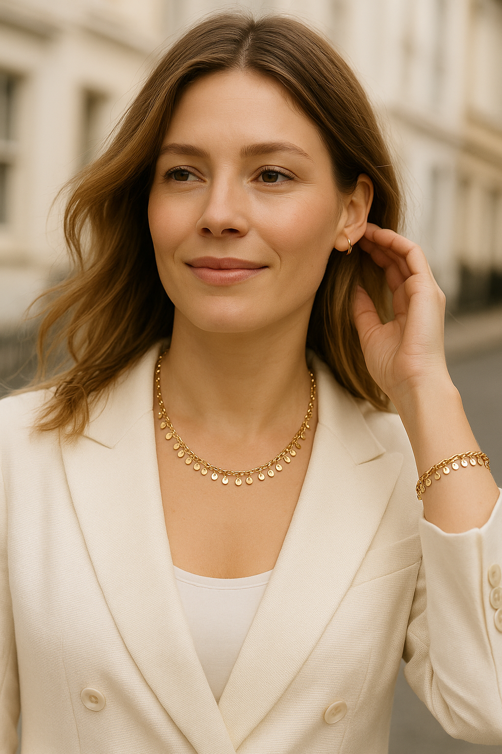 A golden line of light — calm, sculptural, and radiant in its simplicity. Designed to move with you, like sunlight brushing against skin.
